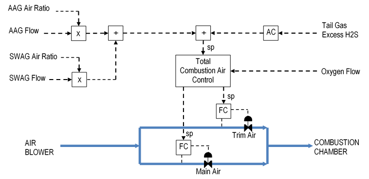 Each acid gas stream requires a certain ratio of air per unit of acid gas flow for proper combustion. This ratio can be used to estimate the air rate needed for each acid gas. Figure 4 shows the two ratio controllers (X) in the combustion air control scheme.